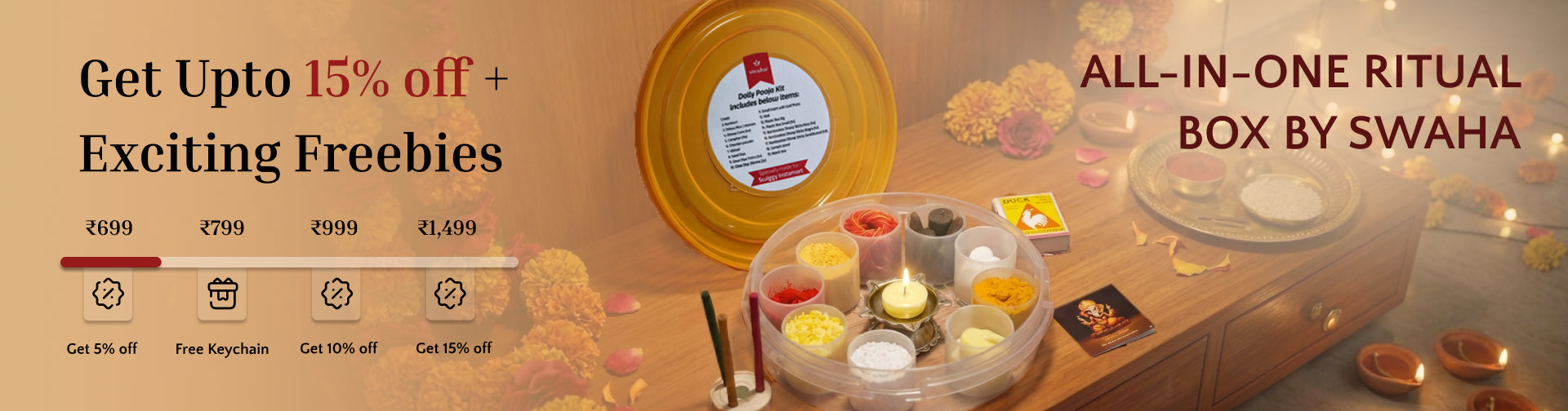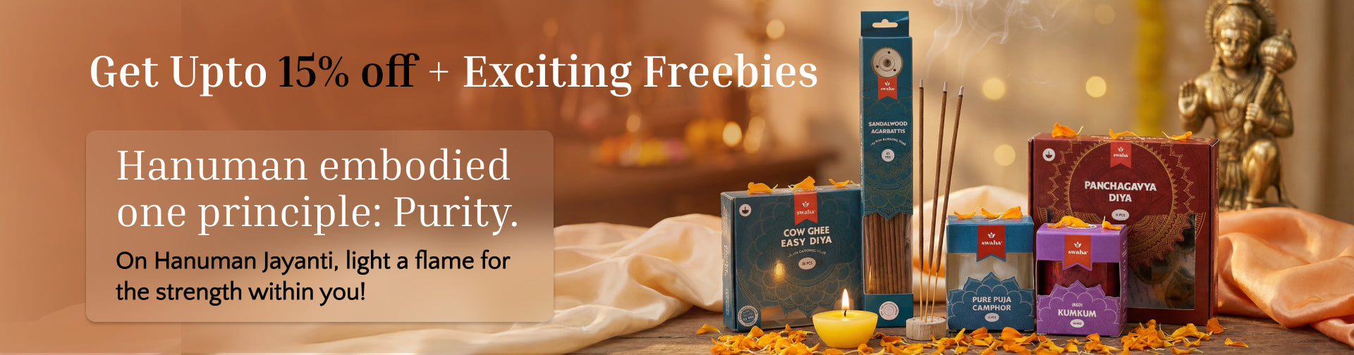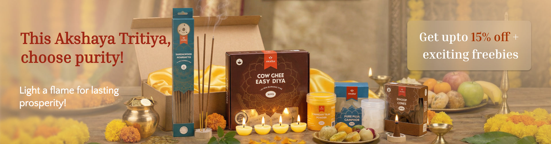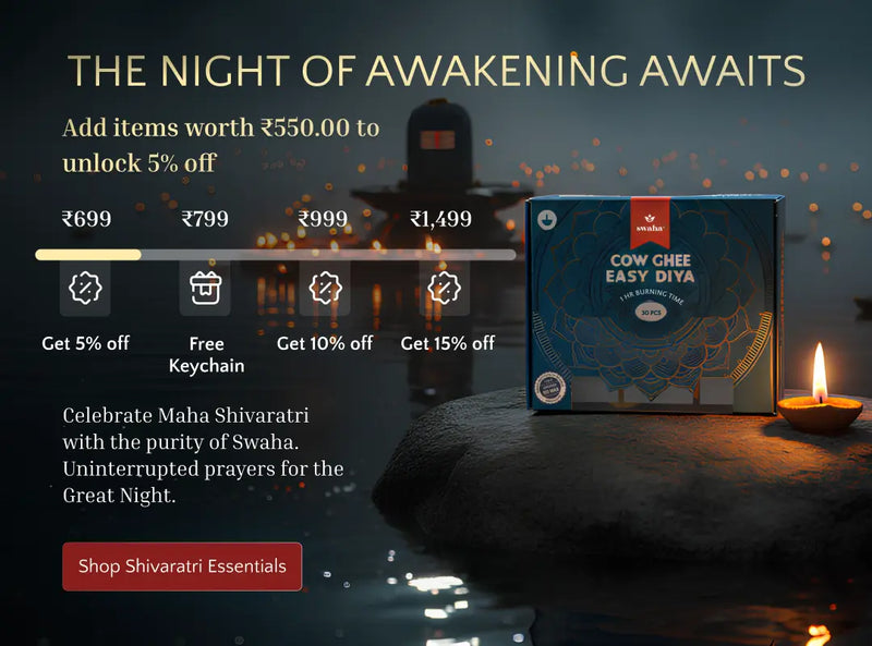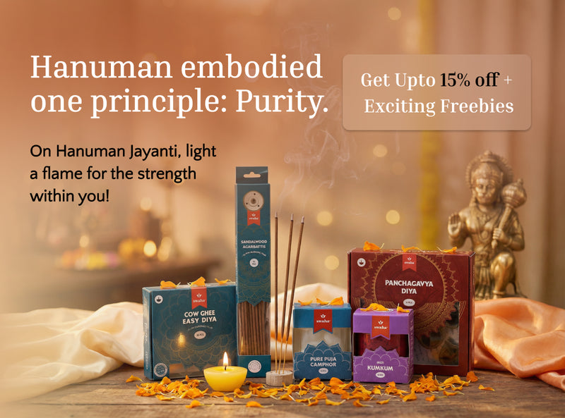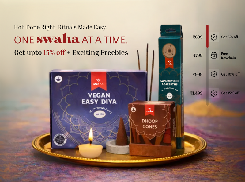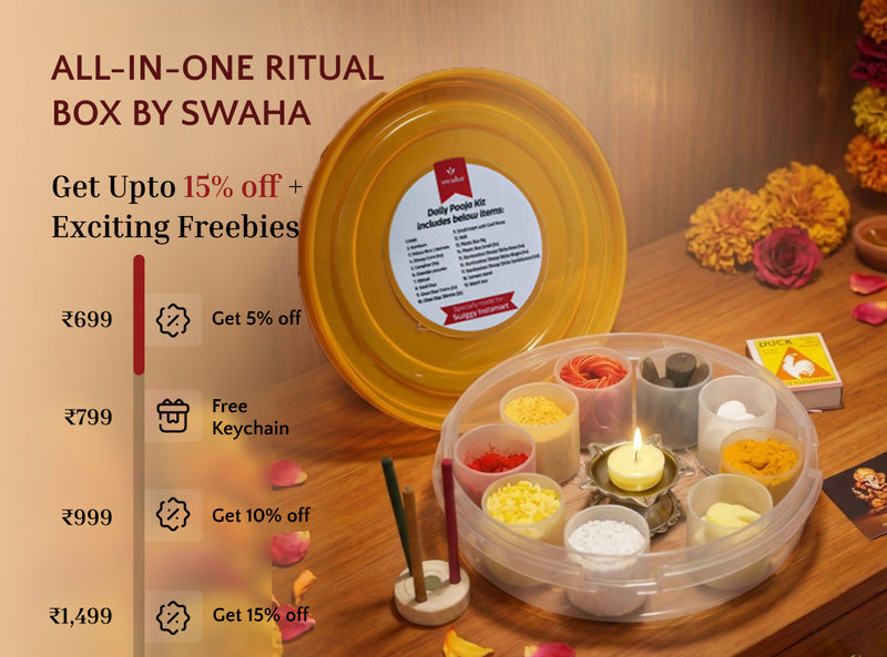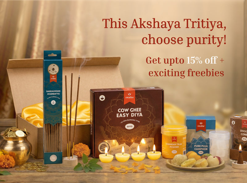 View full detailsSwaha Monthly Puja Pack with Vanaspathi Ghee Diya contains : 1) Two pack Vanaspapti Ghee Diya (30 piece)2) One pack Sandalwood Agarbatti3) One pack...